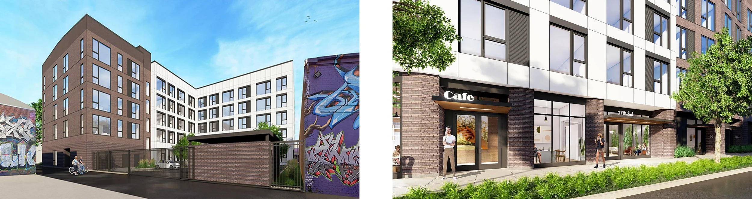 A metaphor for the design was a “new” architecture “hatching” from the traditional shell of mixed-use, multi-family design. Oriel windows, rectilinear forms and a retail base create the “Traditional” frontage of the design along J-Street and reflect a modernized version of this building typology. The residential portion of the building that extends up 17th Street “breaks free” from this shell. It departs from the traditional approach in form, material, and proportion, and connects in a new way to the adjacent residential neighborhoods.